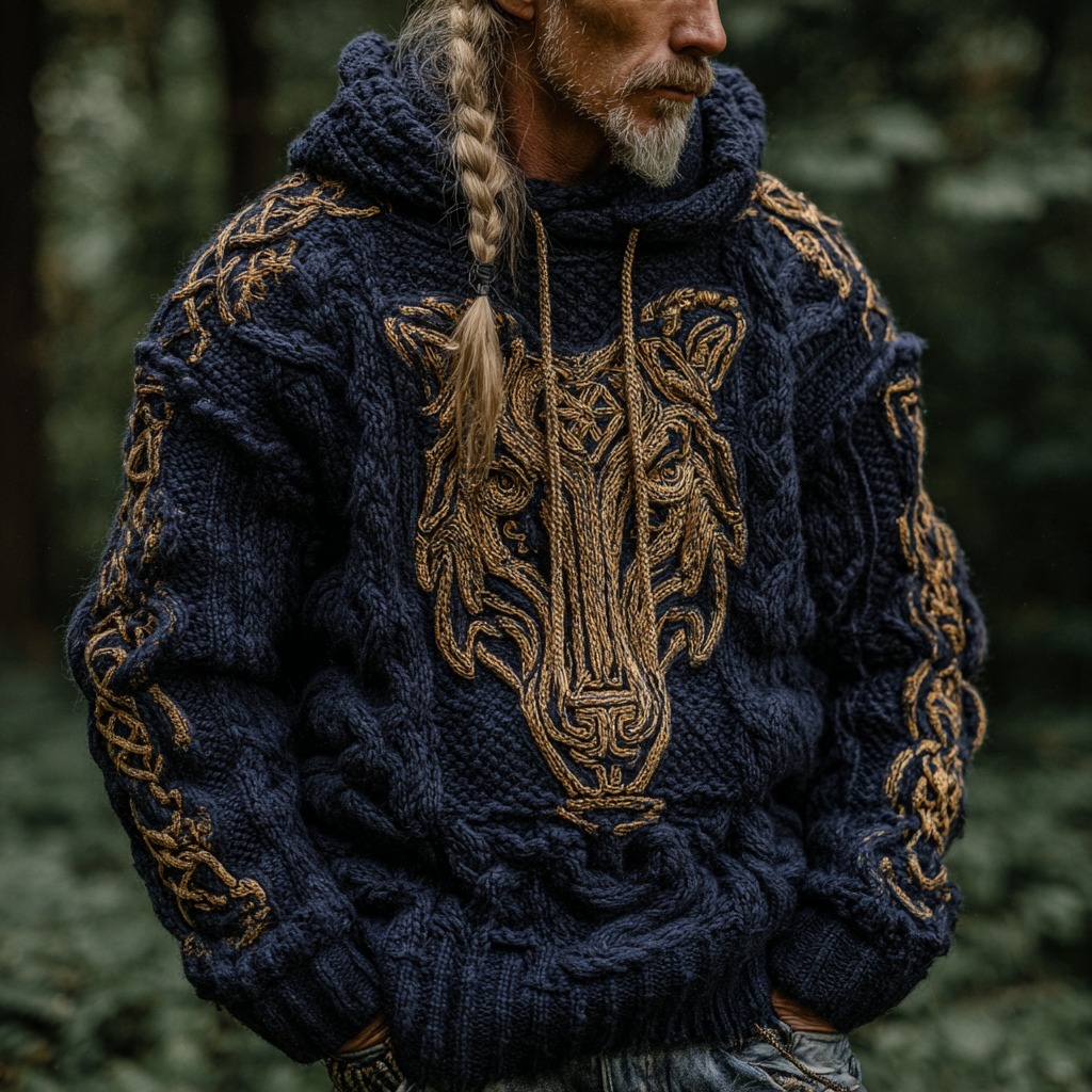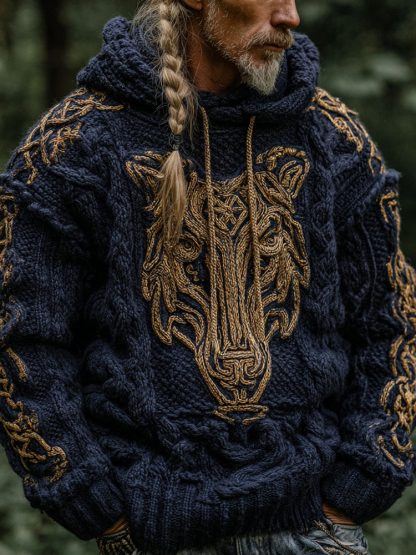 Men's Retro Viking Wolf Colorblock Knitted Warm Hooded Sweater