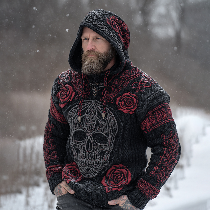 Men's Viking Tribal Jacquard Celtic With Rose And Skull Face Inspired Chunky Knit Hooded Sweater