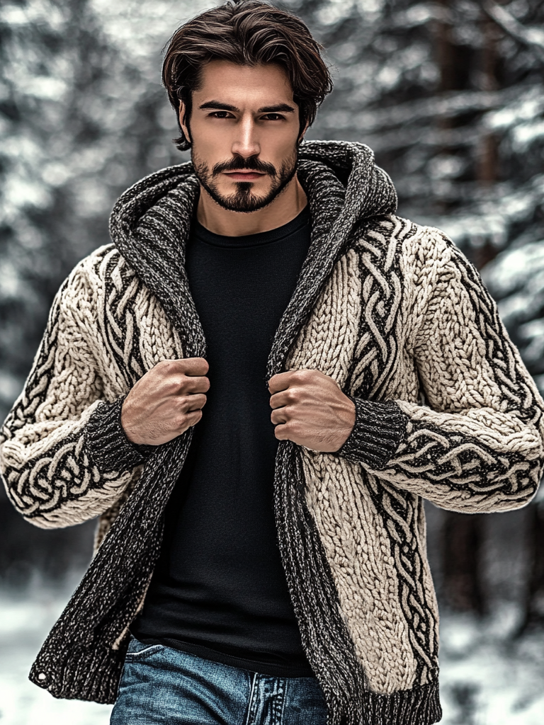 Men's Vintage Celtic Knot Jacquard Chunky Knit Cozy Zip Up Cardigan Sweater