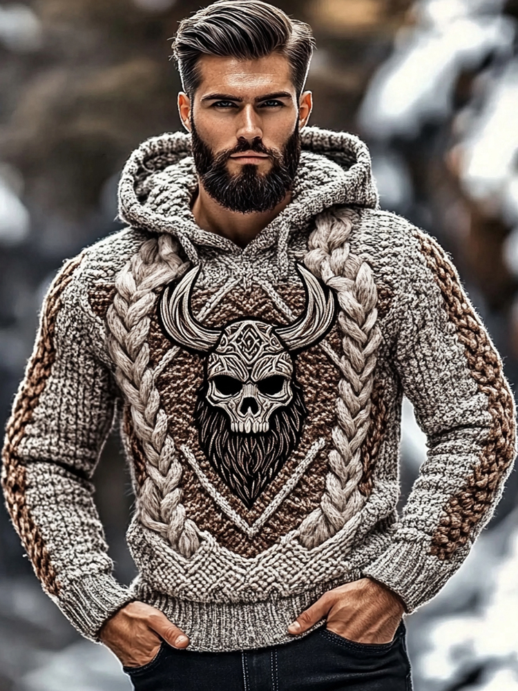 Men's Vintage Viking Skull Cable Jacquard Knit Hooded Sweater