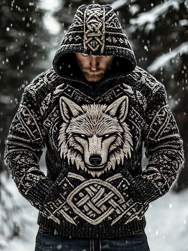 • Men's Viking Wolf Art Knit Pocket Hooded Sweater