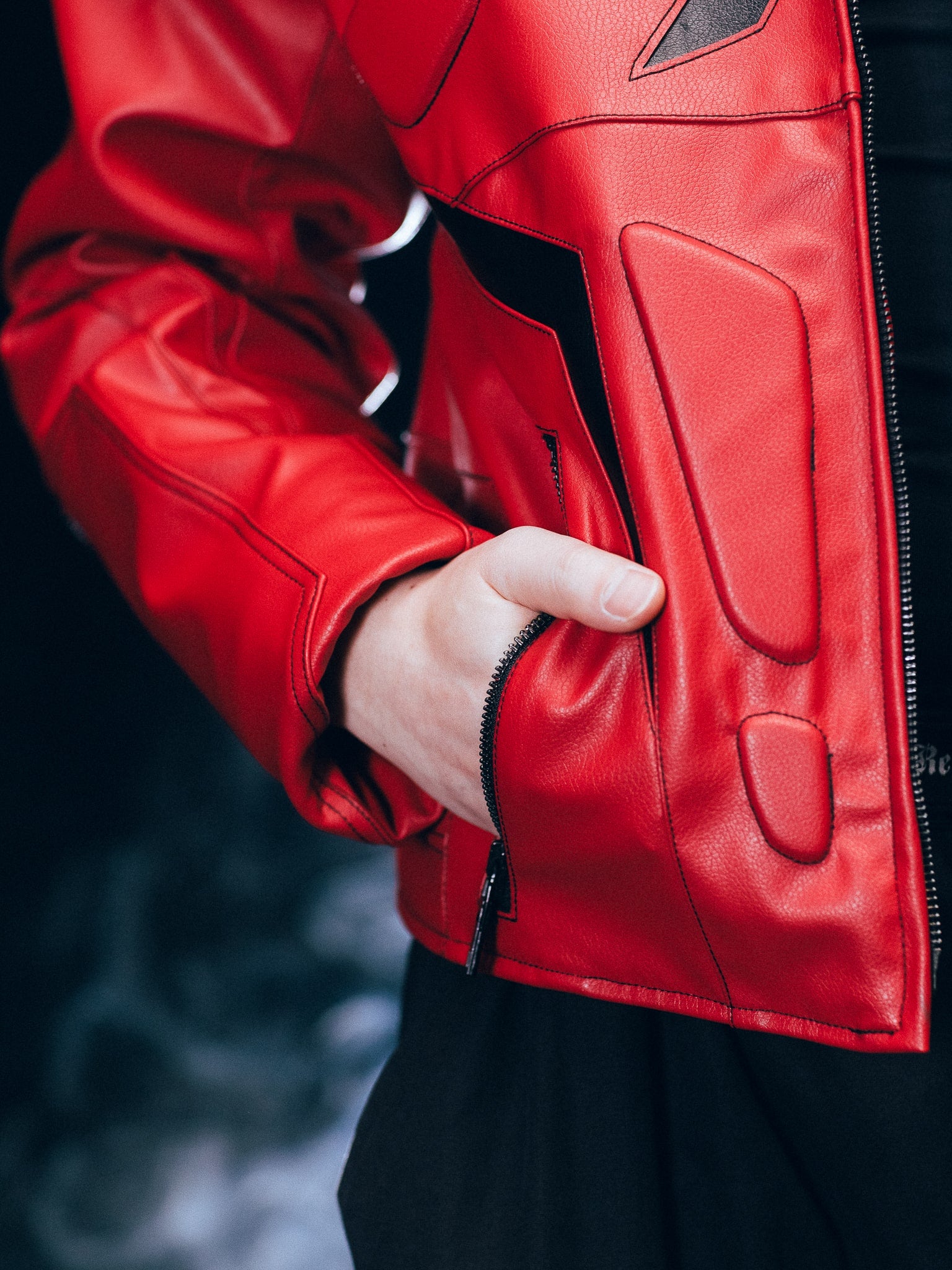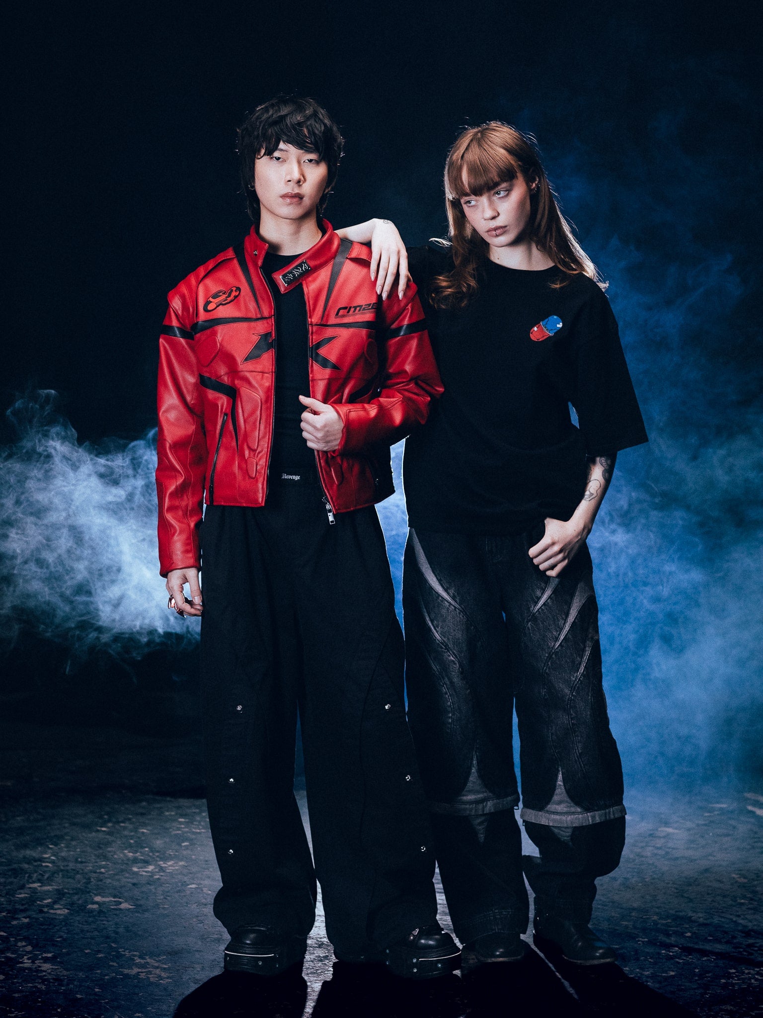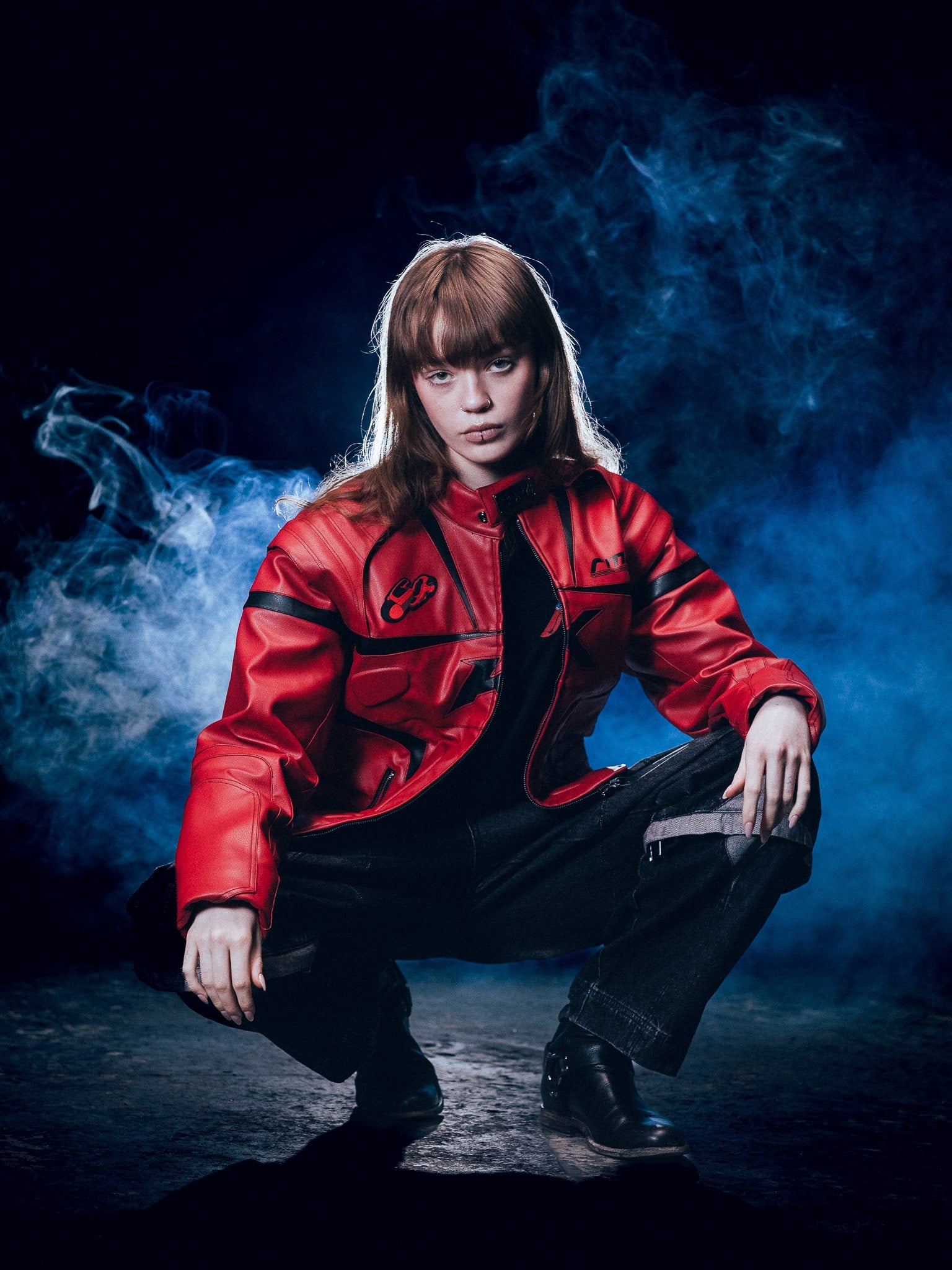 Cropped PU leather jacket with cut-and-sew colour blocking, biker shoulder details, and inner straps that allow the jacket to be worn like a backpack.