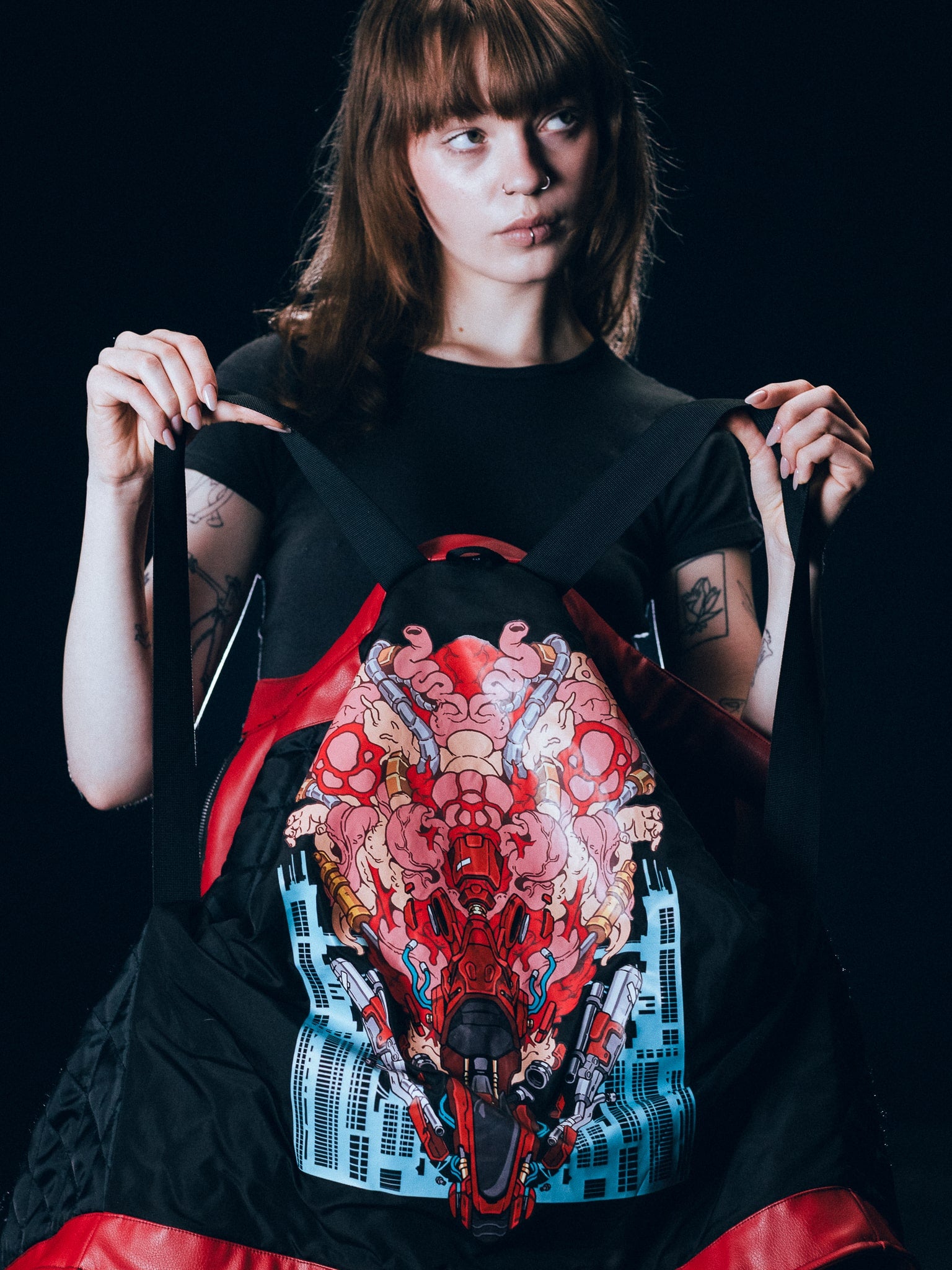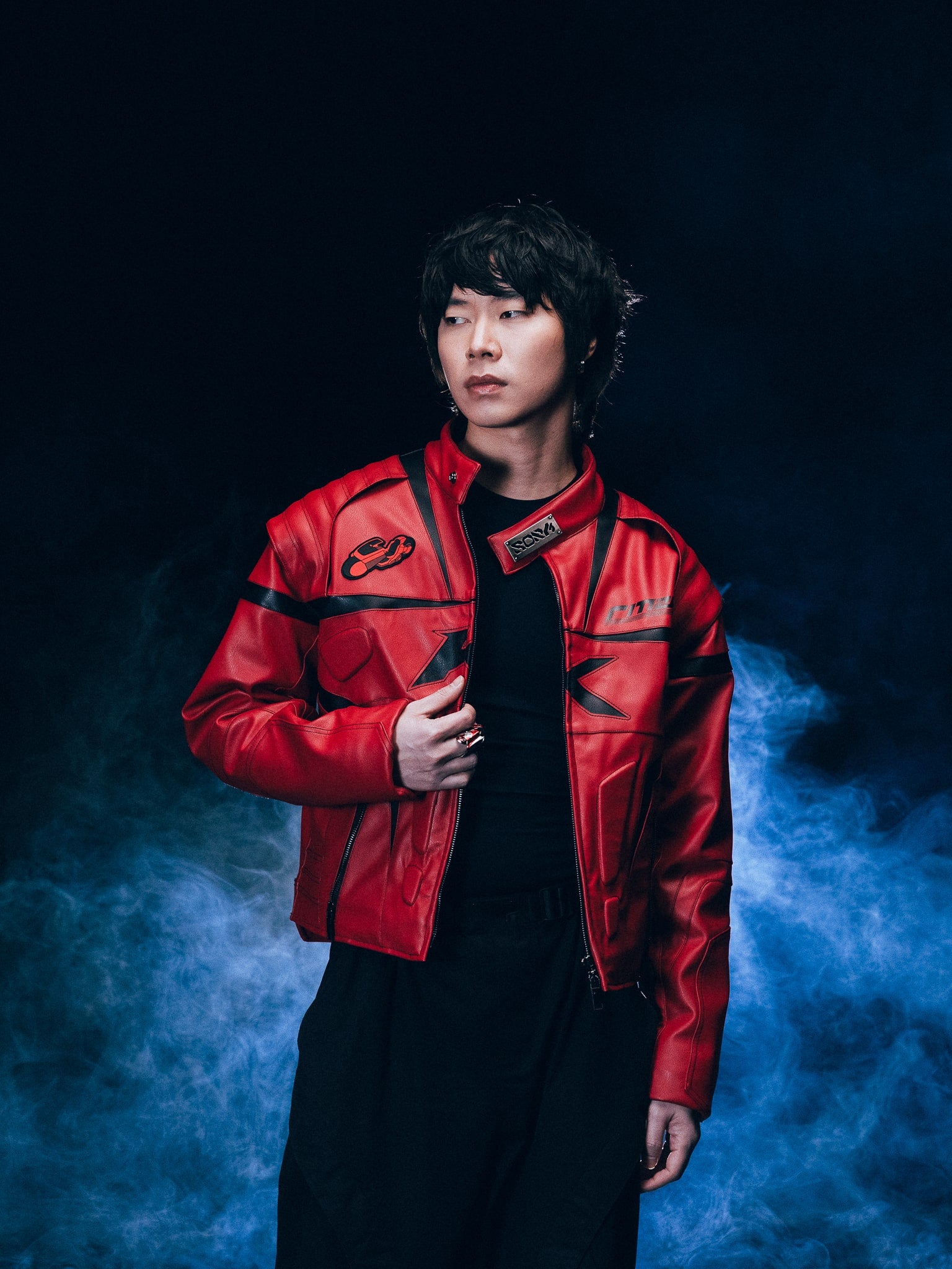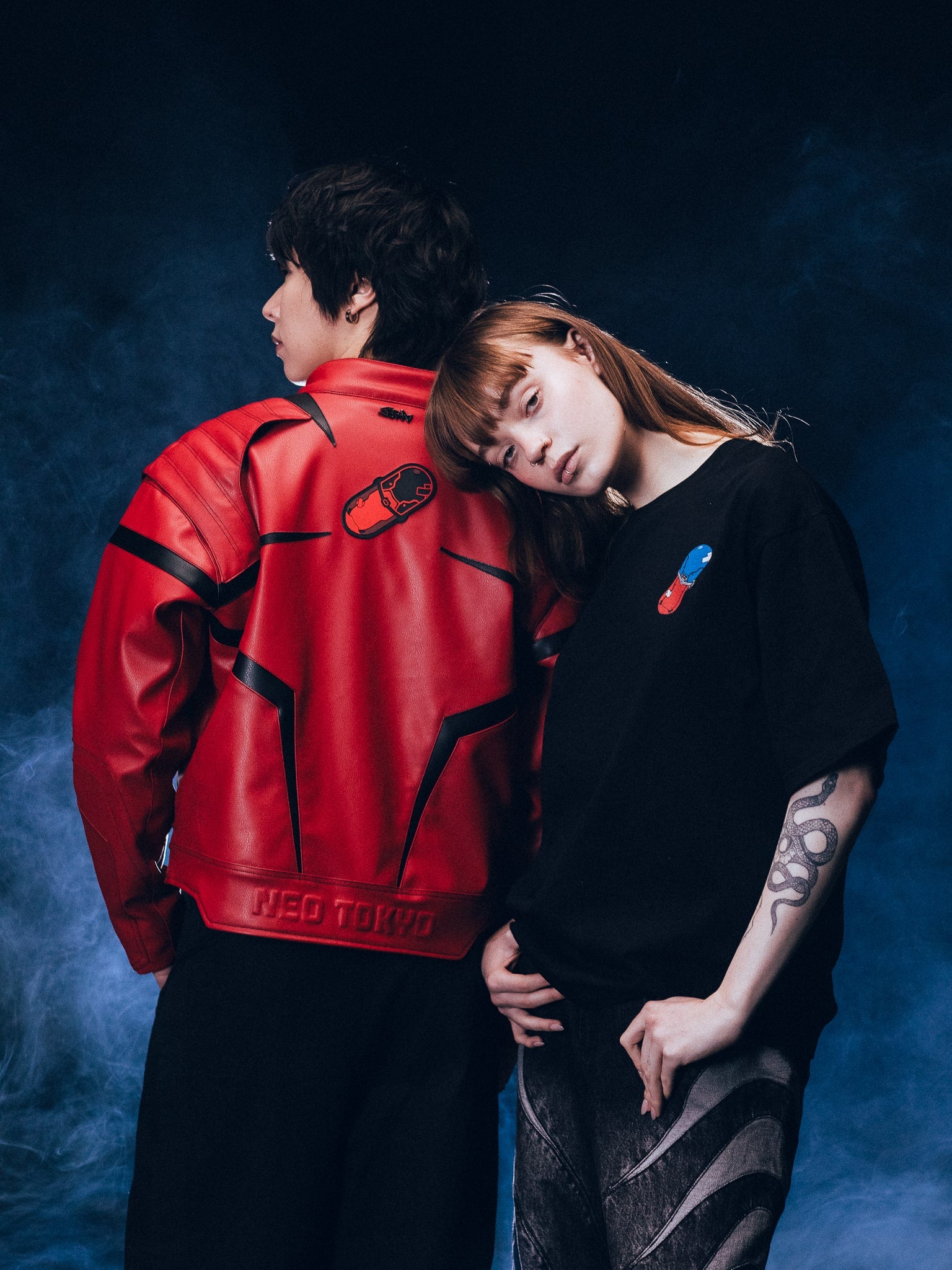 Cropped PU leather jacket with cut-and-sew colour blocking, biker shoulder details, and inner straps that allow the jacket to be worn like a backpack.