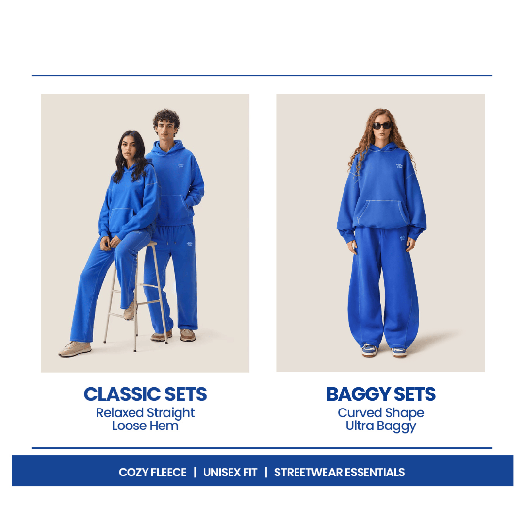 These  redefine street-level comfort with soufflé-soft warmth and weightless insulation. Premium cotton-poly fleece feels soft against the skin, while reinforced stitching and raised foam logos add tactile, high-street detail. The matching sweatpants feature a signature barrel baggy leg, delivering bold volume with fluid, unrestricted flow. Available in a range of versatile core tones and vibrant pops, each set lets you mix, match, and express your street style with ease.