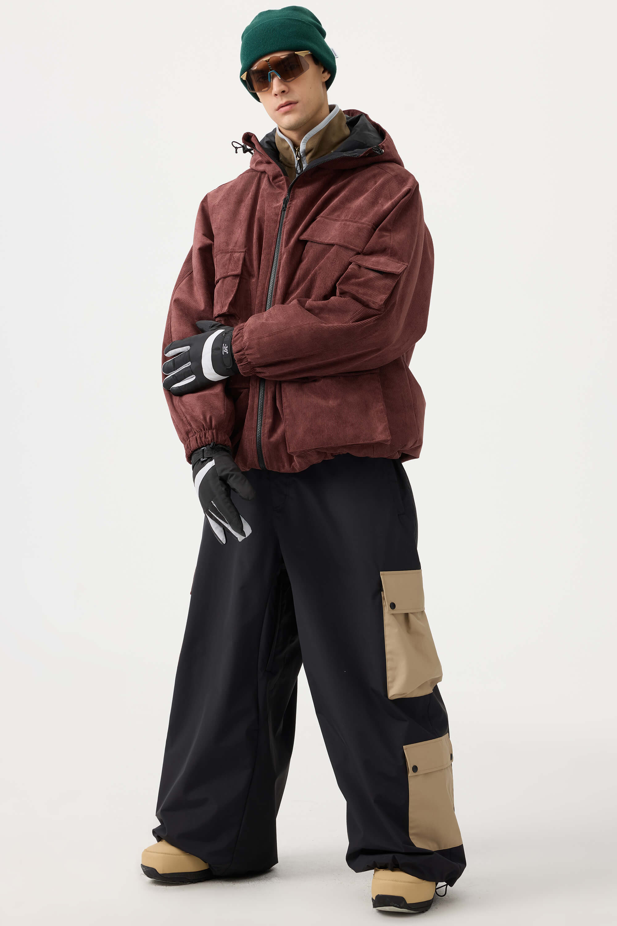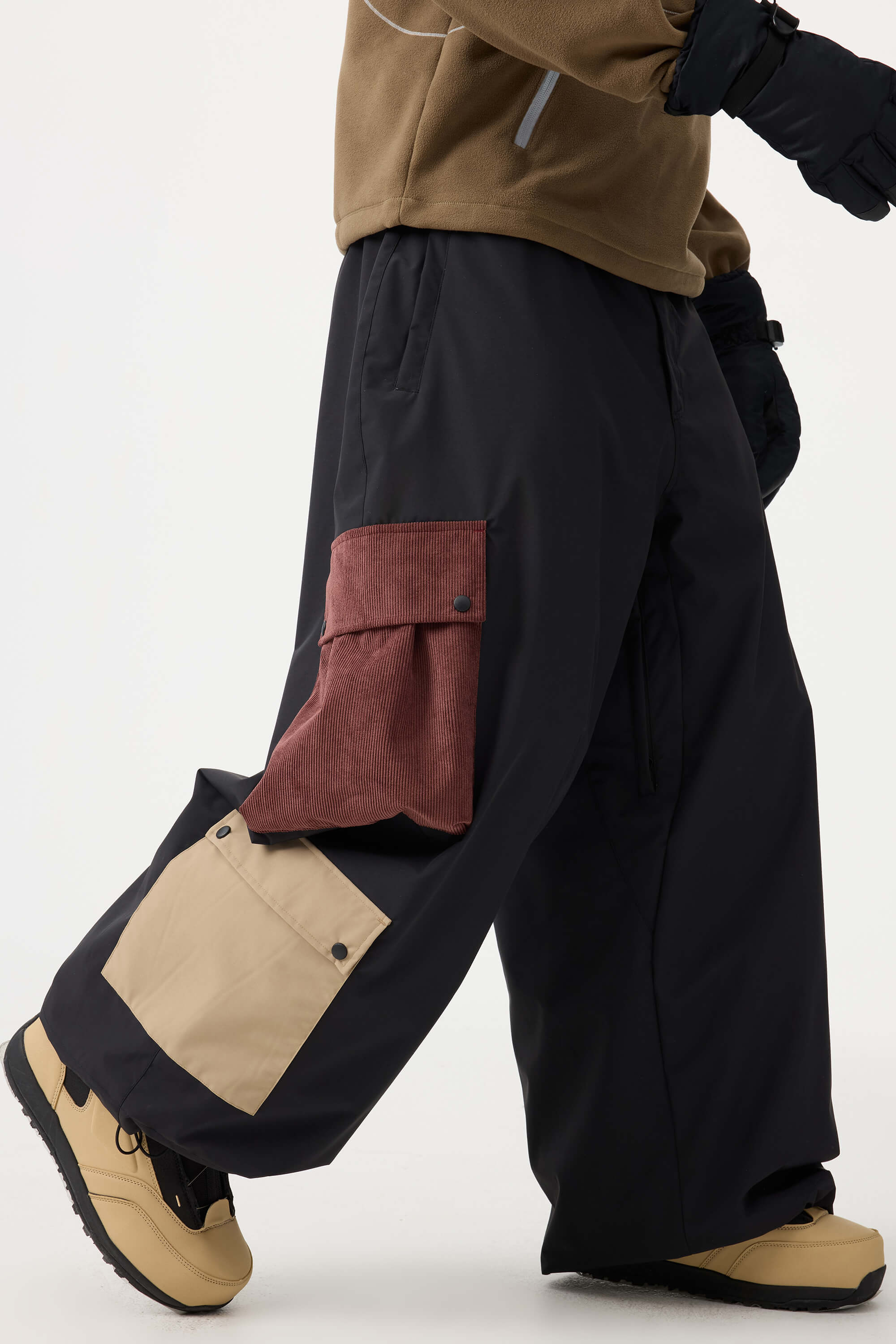 Men's Black Baggy Multi-Pocket Color-Block Snow Pants