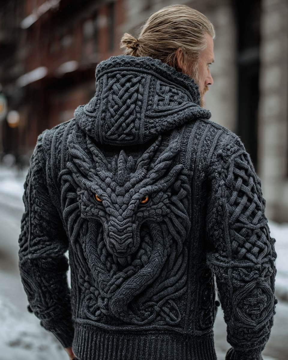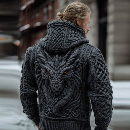 Men's Vintage Viking Dragon Style Celtic Knot Art Chunky Knit Hooded Zip-up Sweater