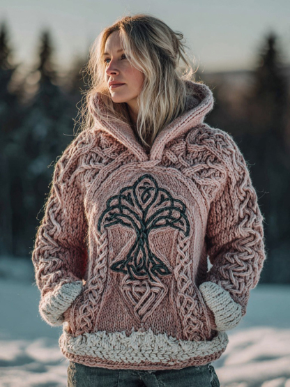 Women's Vintage Viking Tree Of Life Knitted Jacquard Warm Hooded Sweater