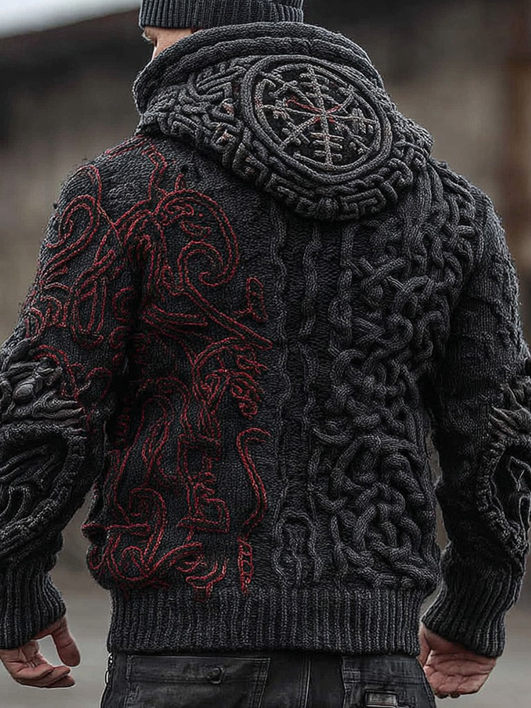 Men's Vegvisir Viking Celtic Runes Colorblock Design Cozy Chunky Zipper Up Hooded Sweater