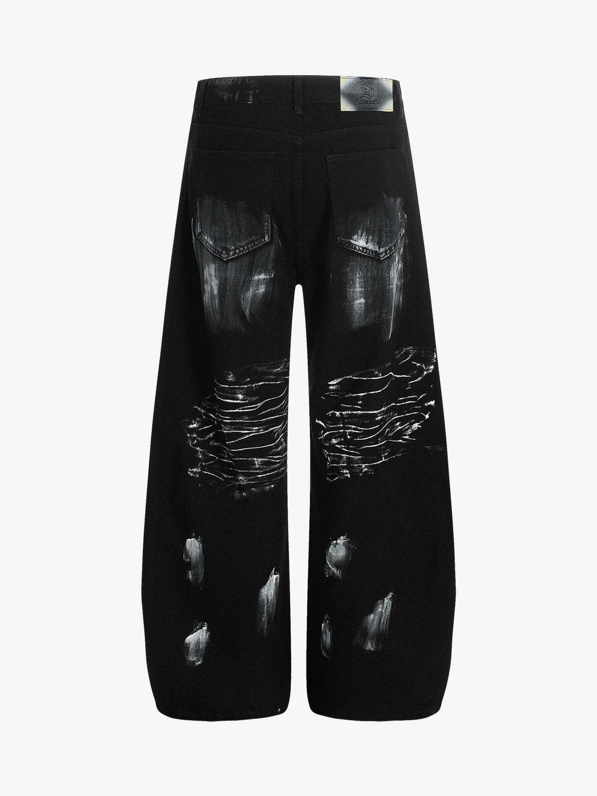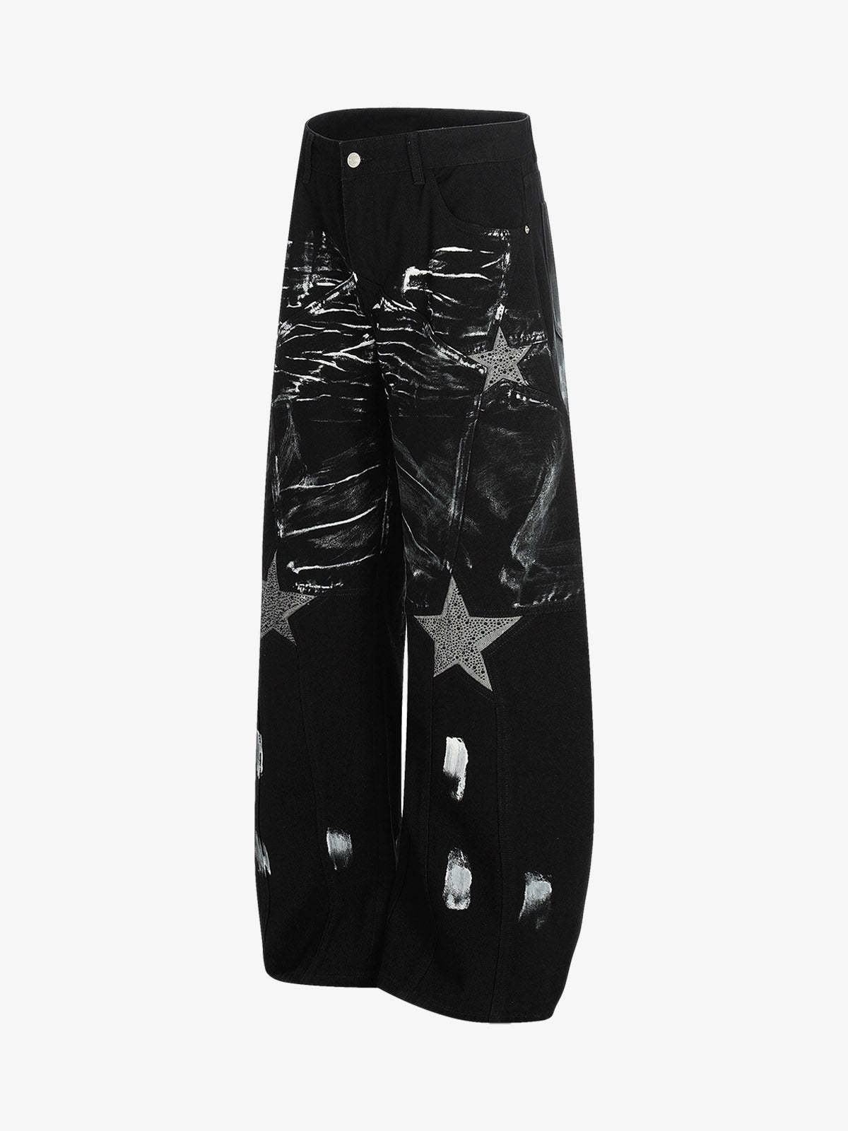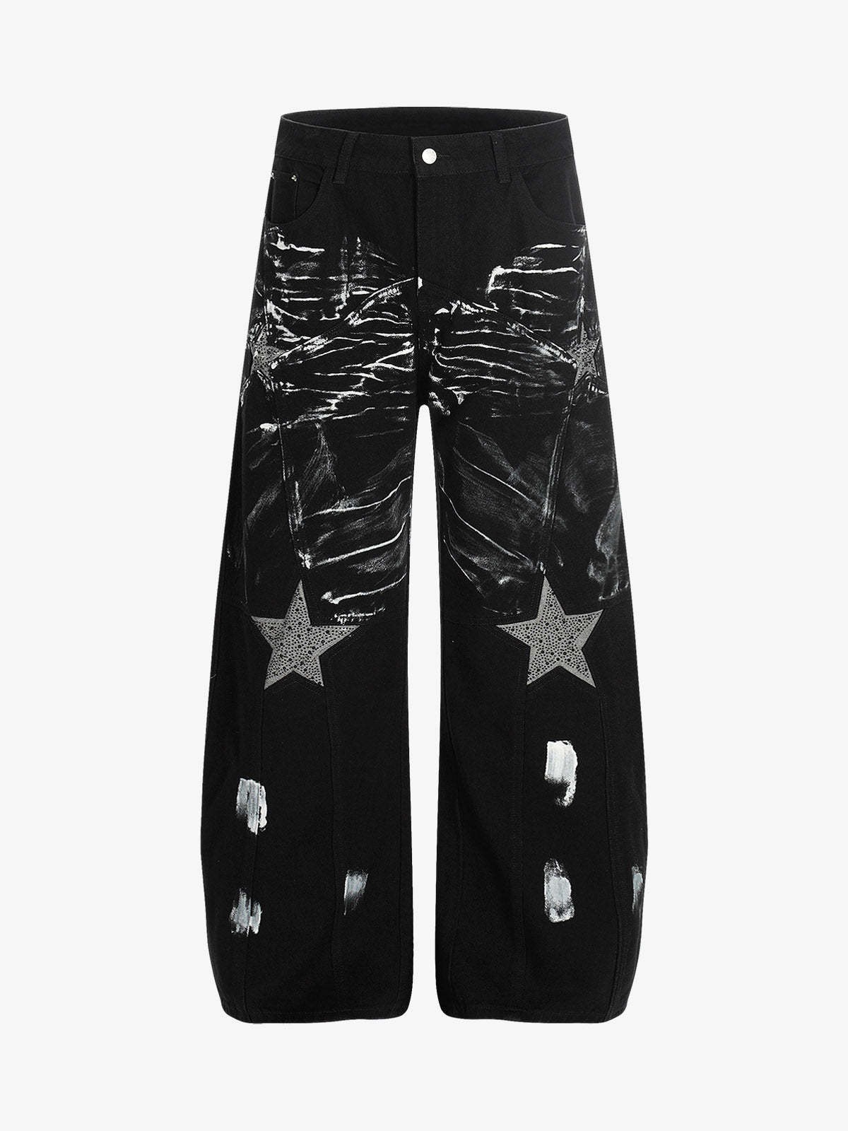 • Design Elements: Distressed patches, star embellishments, wide-leg silhouette