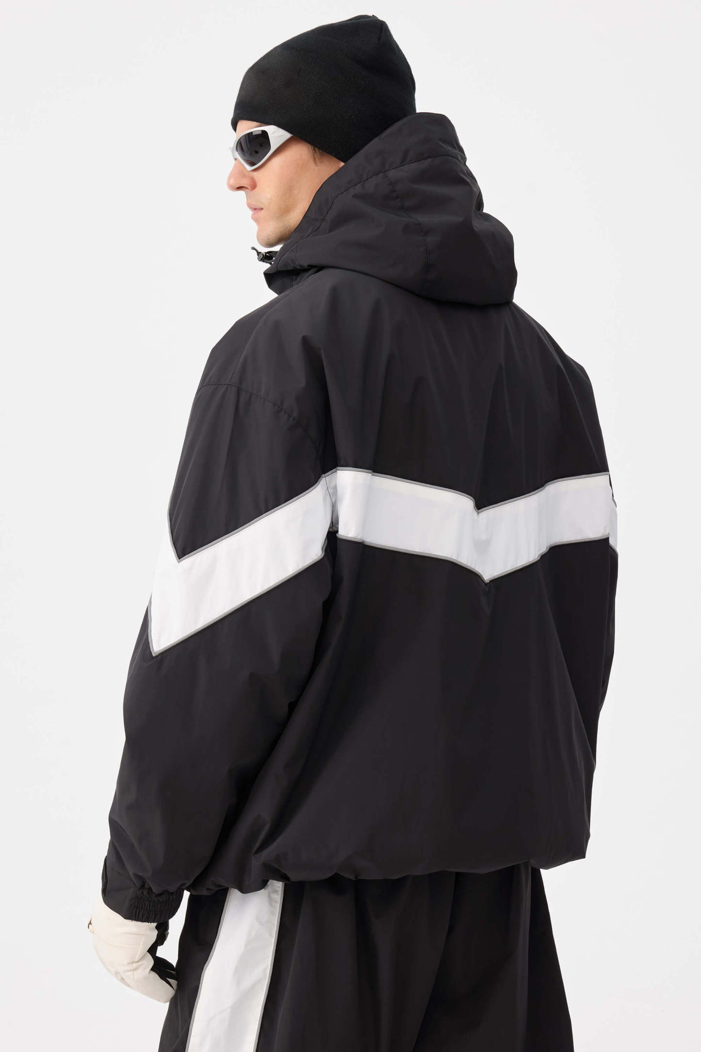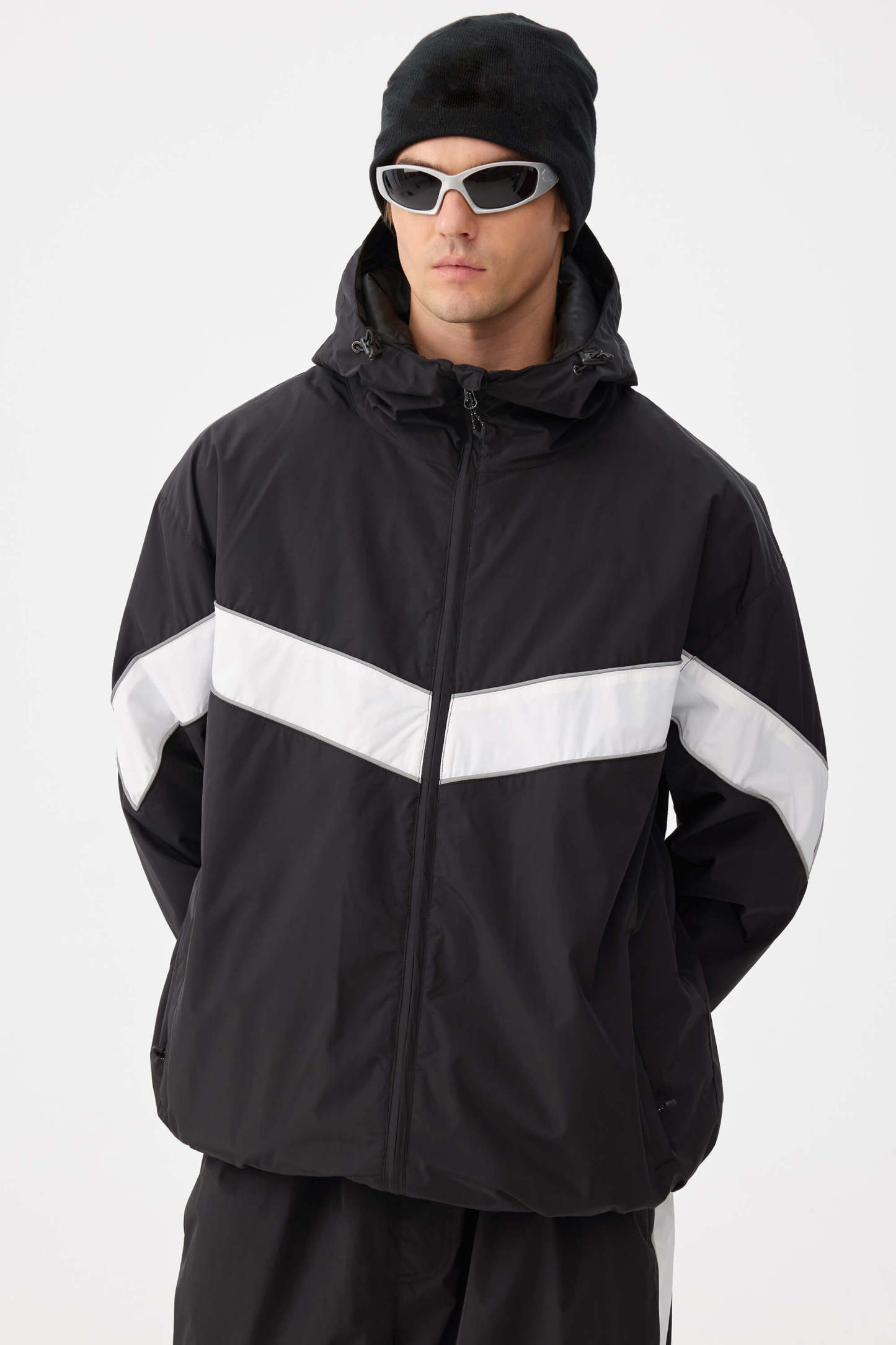 Featuring clean lines with reflective piping and white segmented detailing, this jacket’s silhouette is defined by seam-highlighting reflective trim. Lightweight and weather-resistant, it moves effortlessly from city streets to snowy slopes, offering visibility and style in low light.
