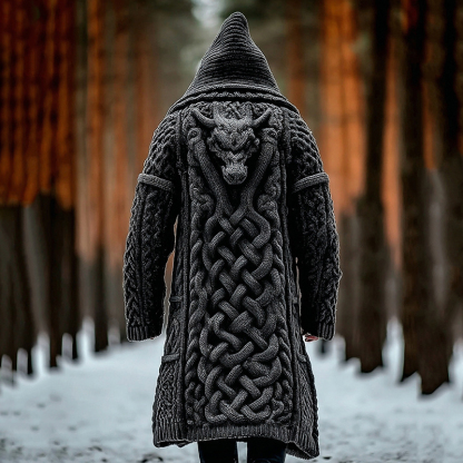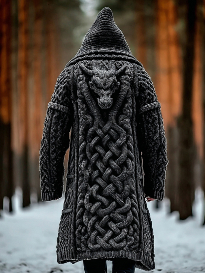 Men's Viking Dragon Head Intricate Celtic Knot Pocket Mid Length Cardigan Sweater