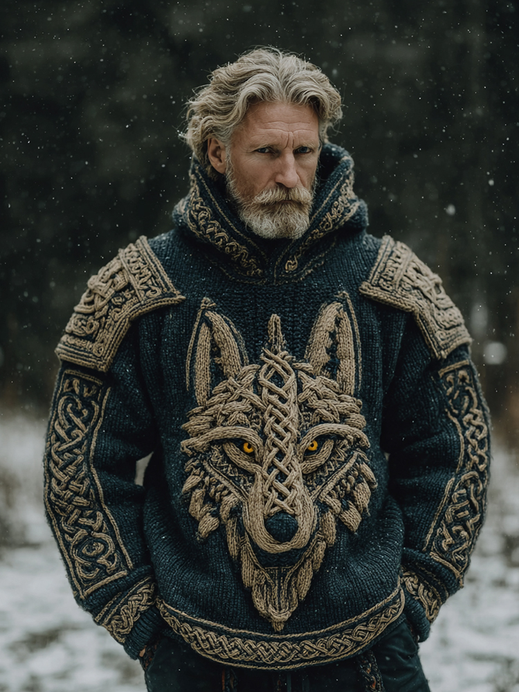 Men's Vintage Viking Celtic Knot Wolf Art Knit Hooded Sweater