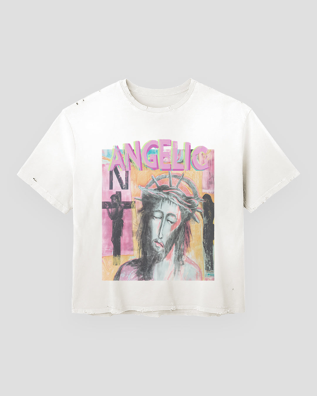 The Crowned Corpus Tee, where rebellion wears a crown of thorns. Faded colors distort like memory, and the print hovers between icon and illusion. Washed in sun-faded tones and crowned in anguish, this piece captures the raw silhouette of sacrifice and salvation through brush-stroked expressionism. In its silence, the design speaks volumes—inviting the viewer to confront beauty born from pain, and wear it boldly as their own reckoning.