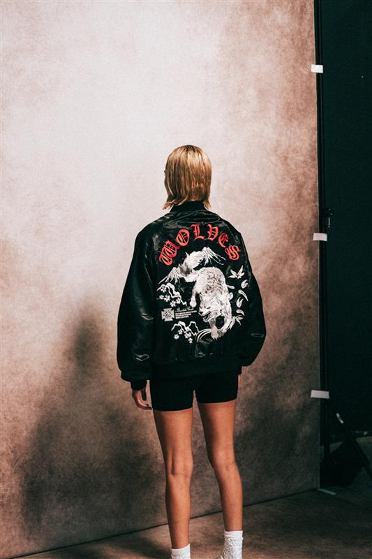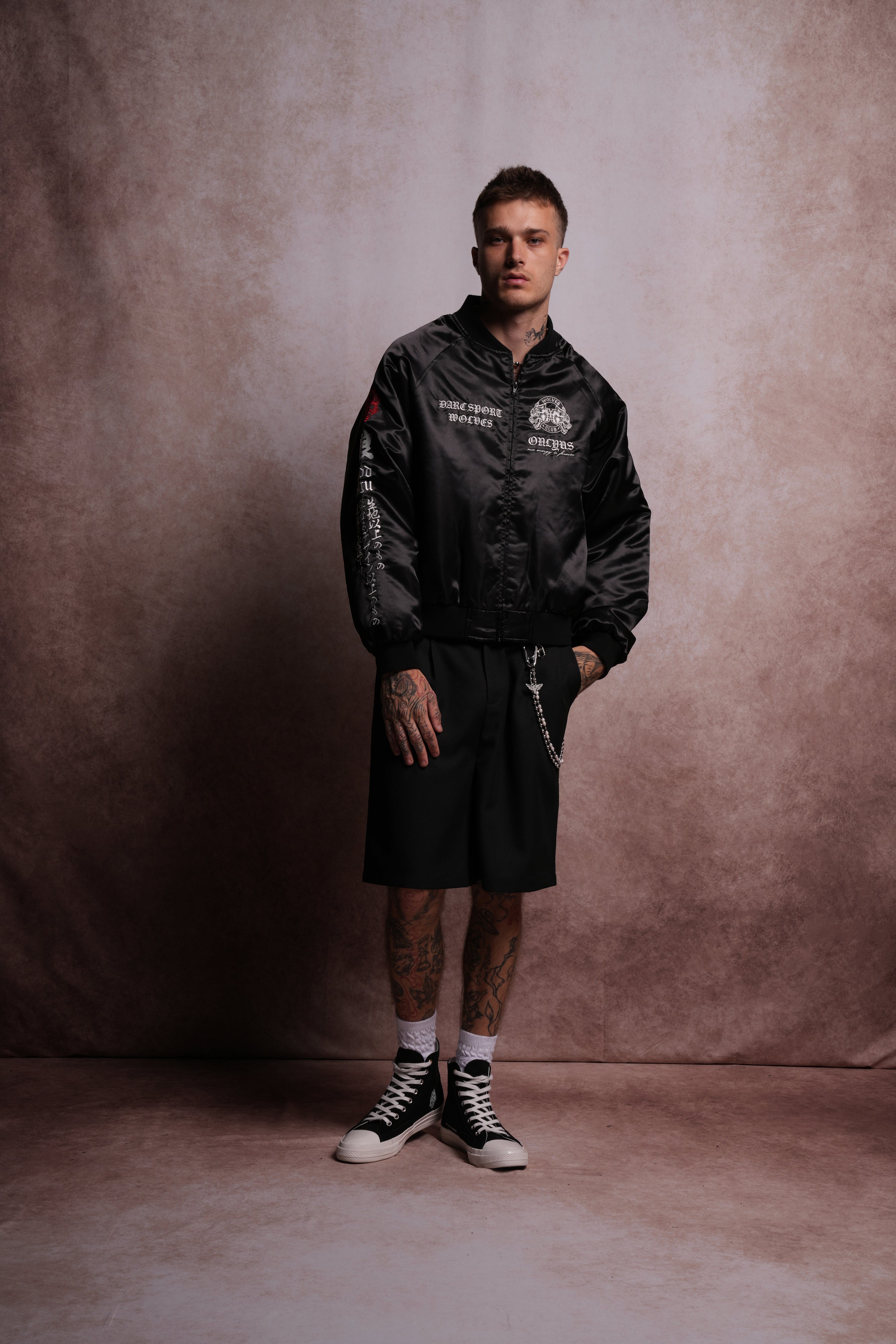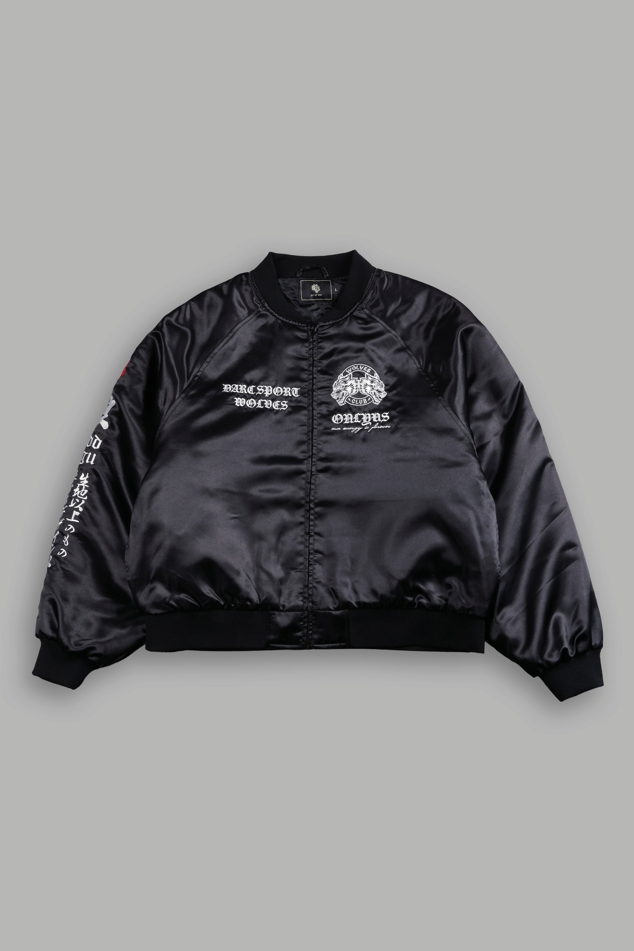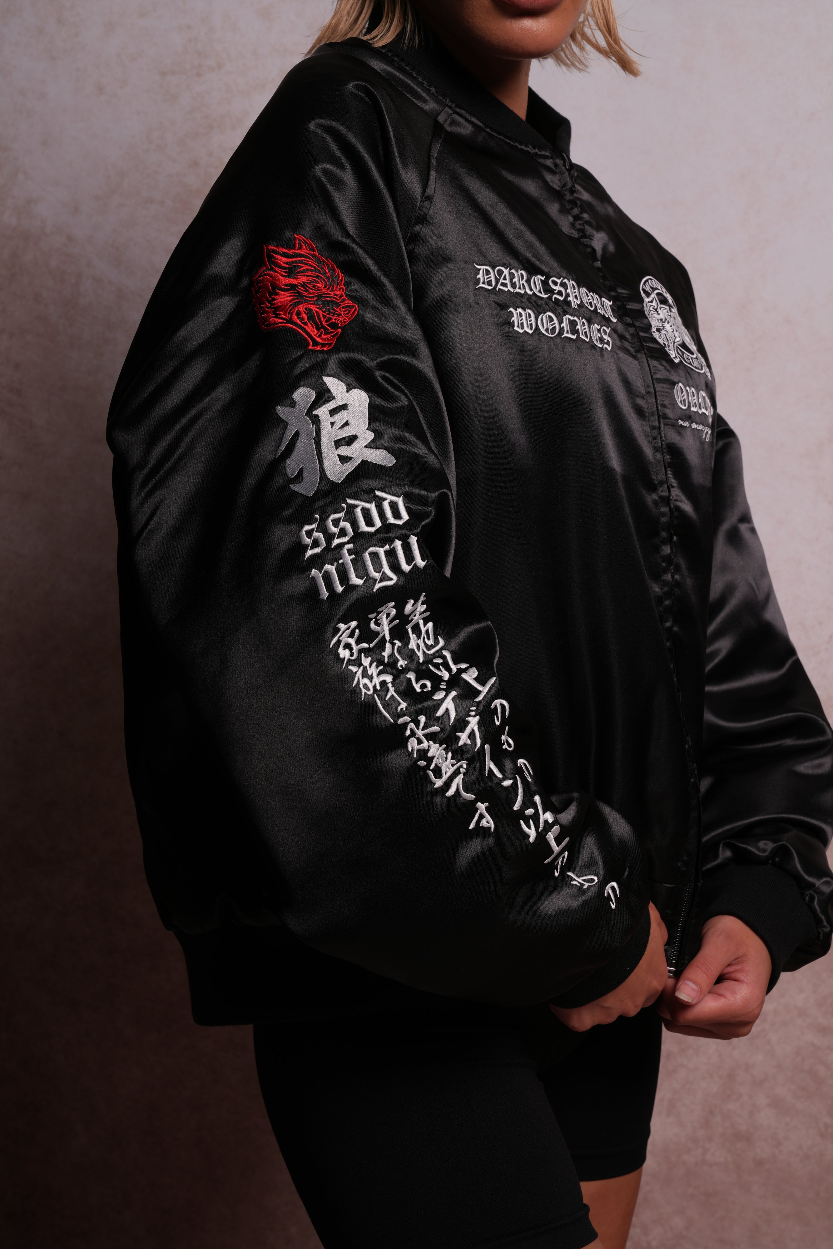 Darc Okami Cropped Satin Bomber Zip Jacket in Black