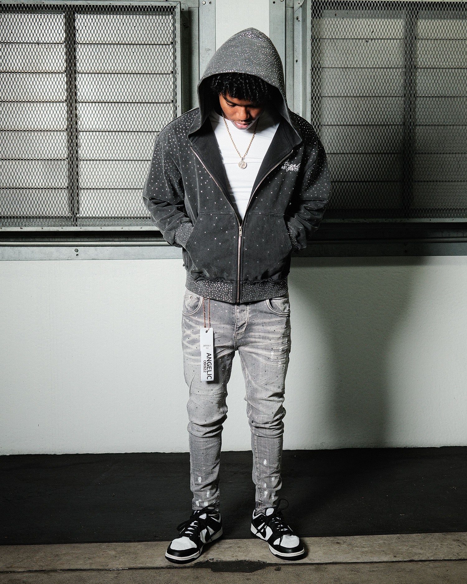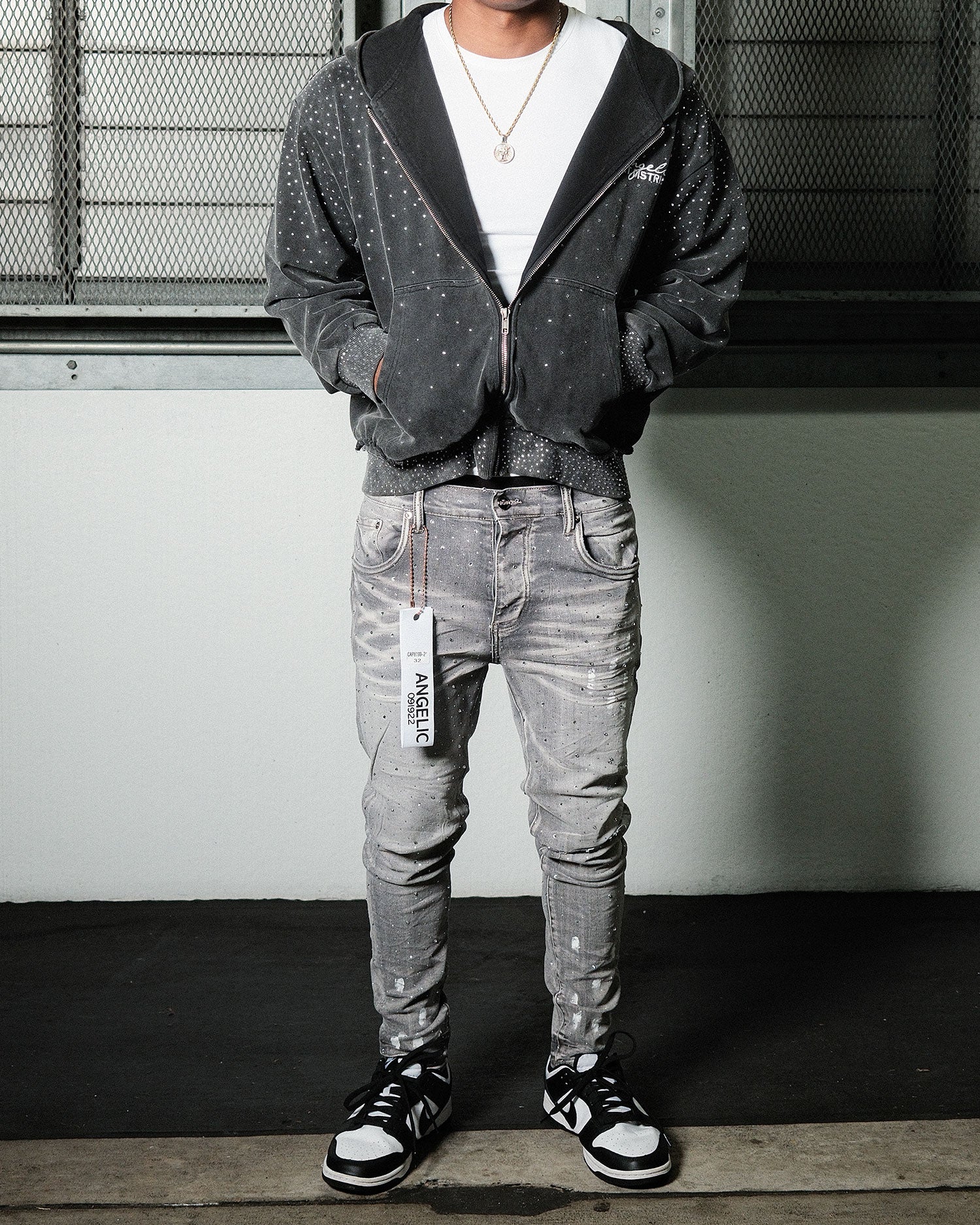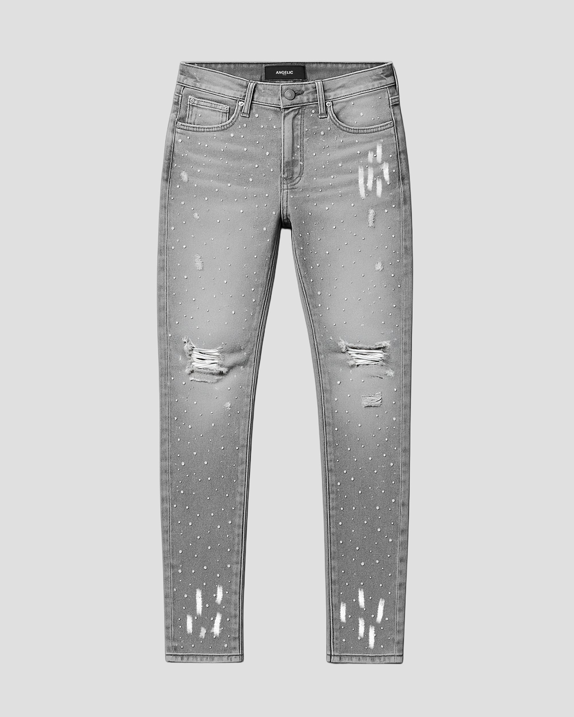 The set ends; the story doesn’t. Encore is built for the hours after the lights drop. Aged denim becomes the stage itself, while a constellation of hand-set rhinestones bounces camera flashes like a moving light rig; paint hits read as honest overspray from rehearsal floors and backstage walls. The slim profile trims the line and stacks clean at the hem, letting the details do the talking. Crafted with intention, this pair blends late-night shine with lived-in truth—made to return, not retreat.