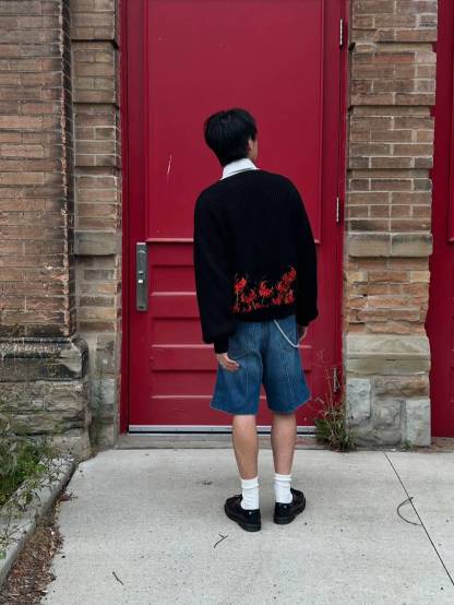 - Bold red floral embroidery pops on deep black knit.