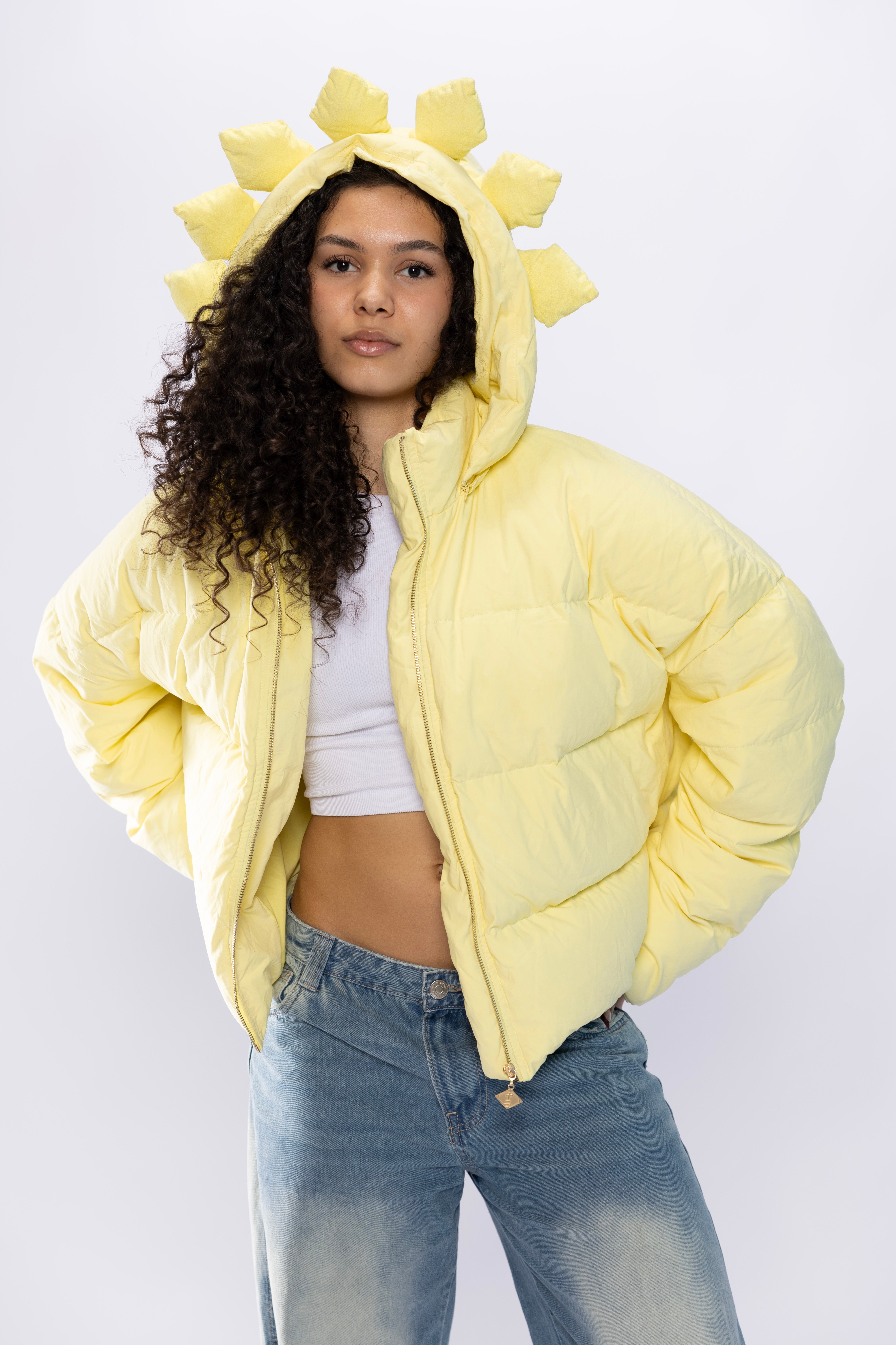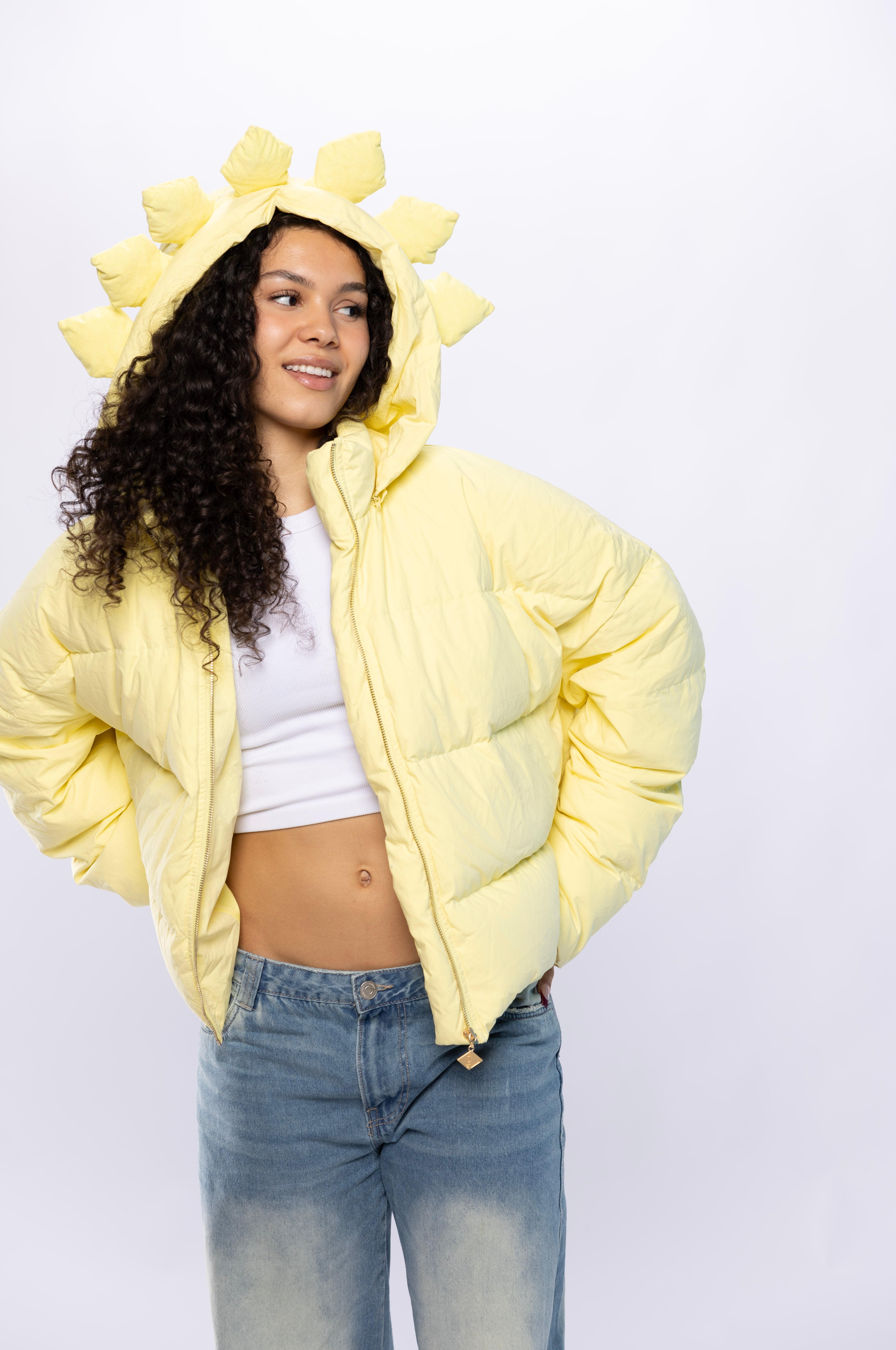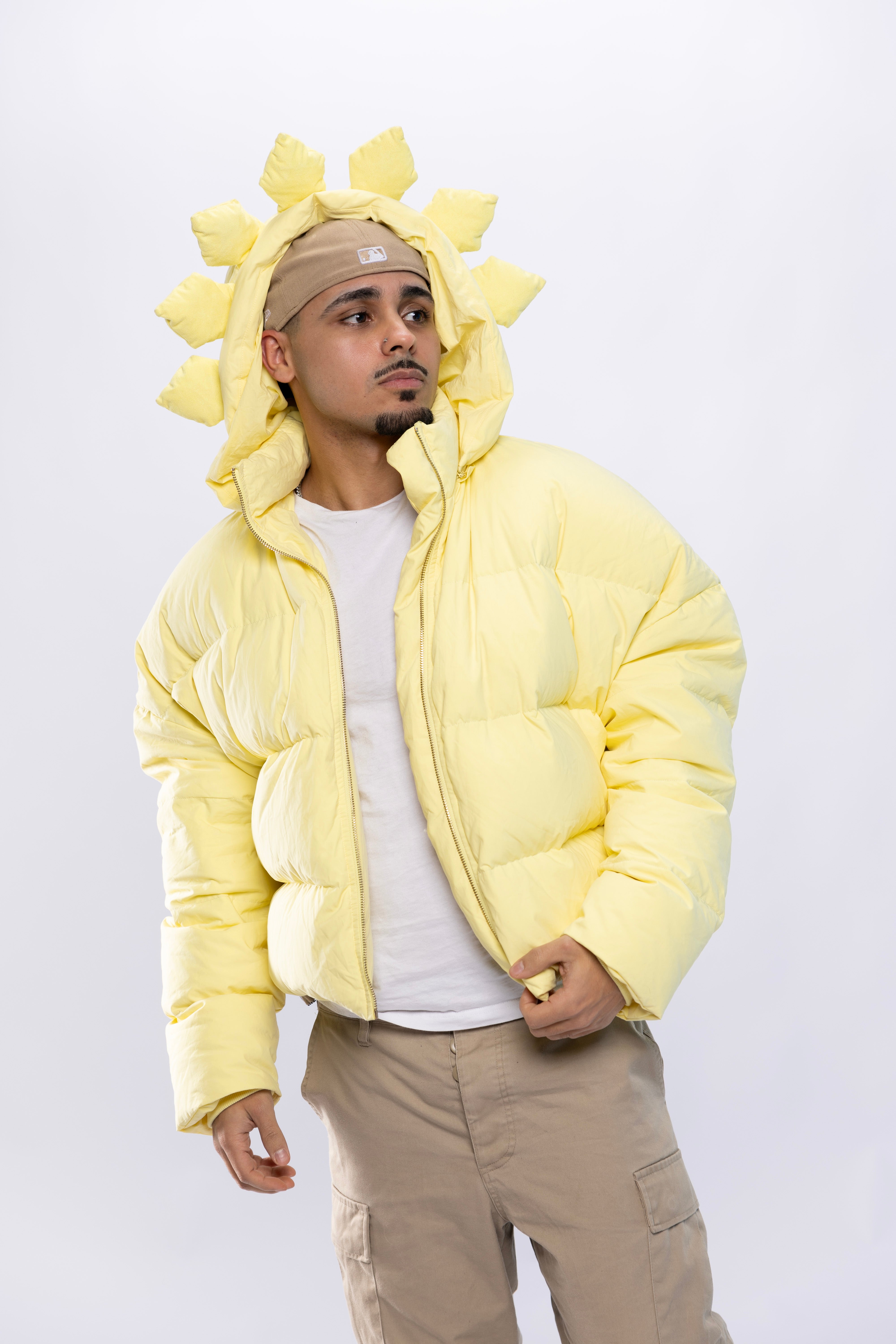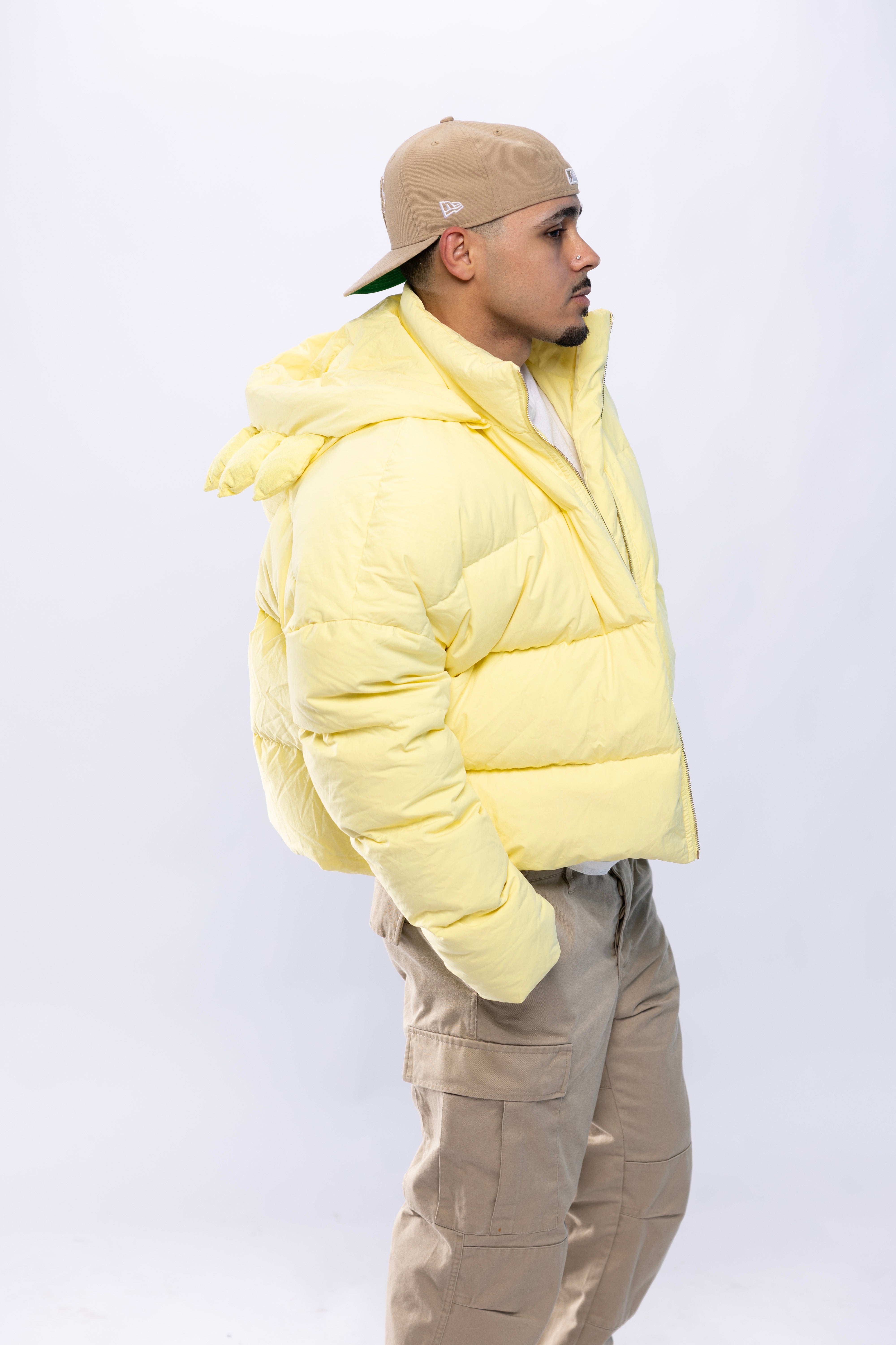 Turn heads in the AntiShadow Puffer Jacket, a bright pastel yellow masterpiece designed to make a statement. Featuring a unique hood, custom gold-colored zipper, and an adjustable waist for the perfect fit, this puffer jacket combines boldness with versatility. Stay warm and stylish while standing out from the shadows.