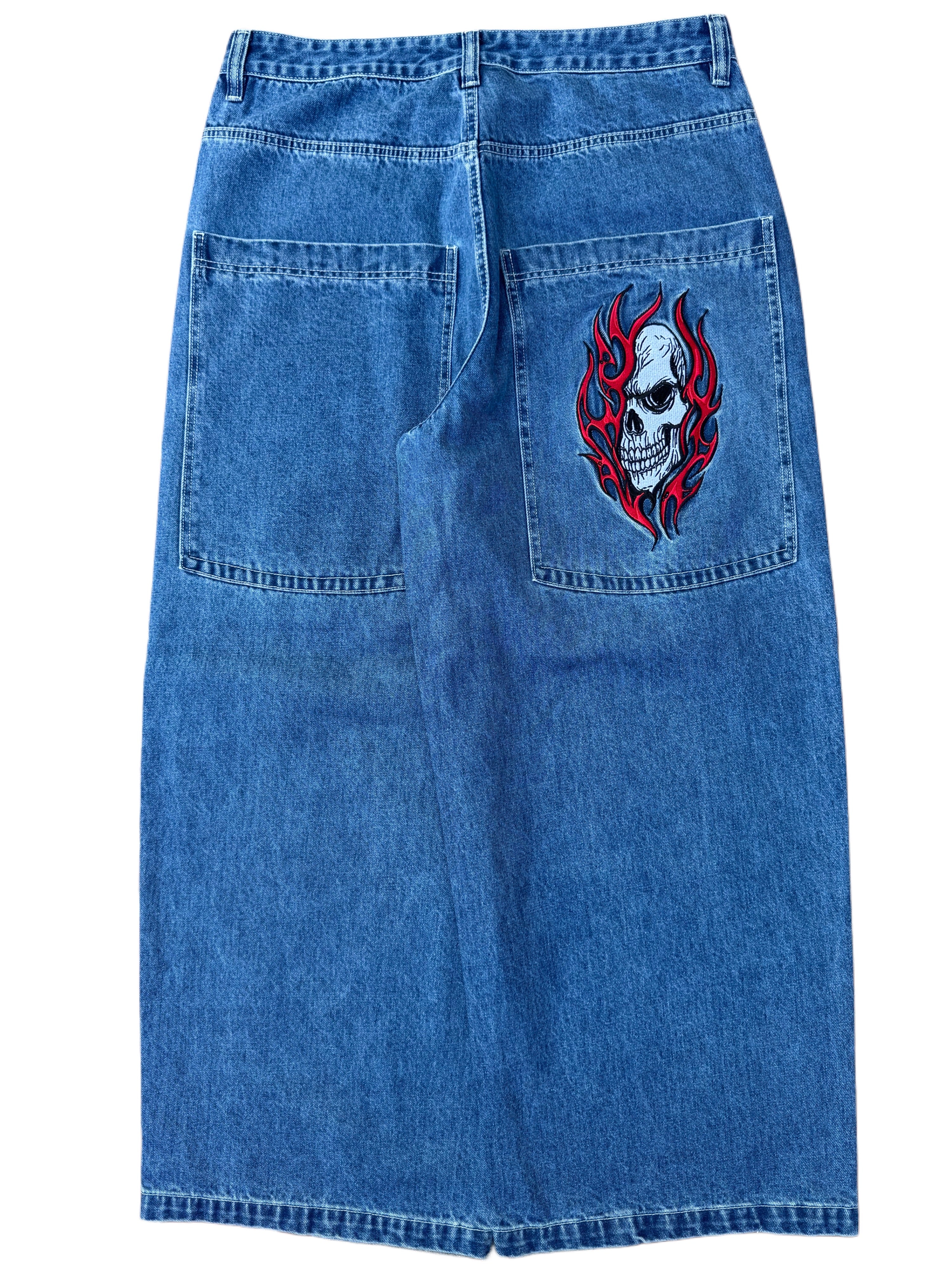 Blue Wide Leg GLOE Flaming Skull Jeans