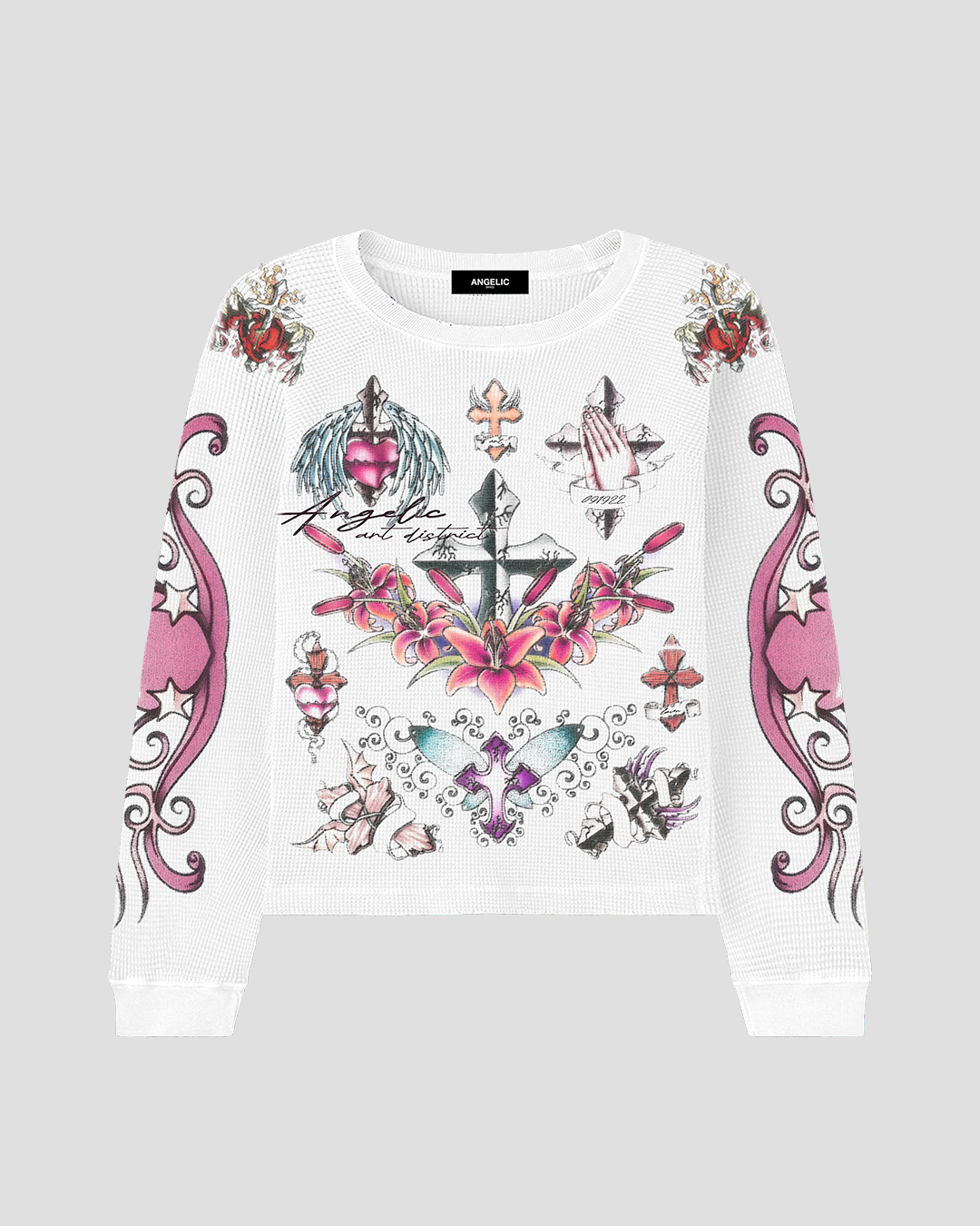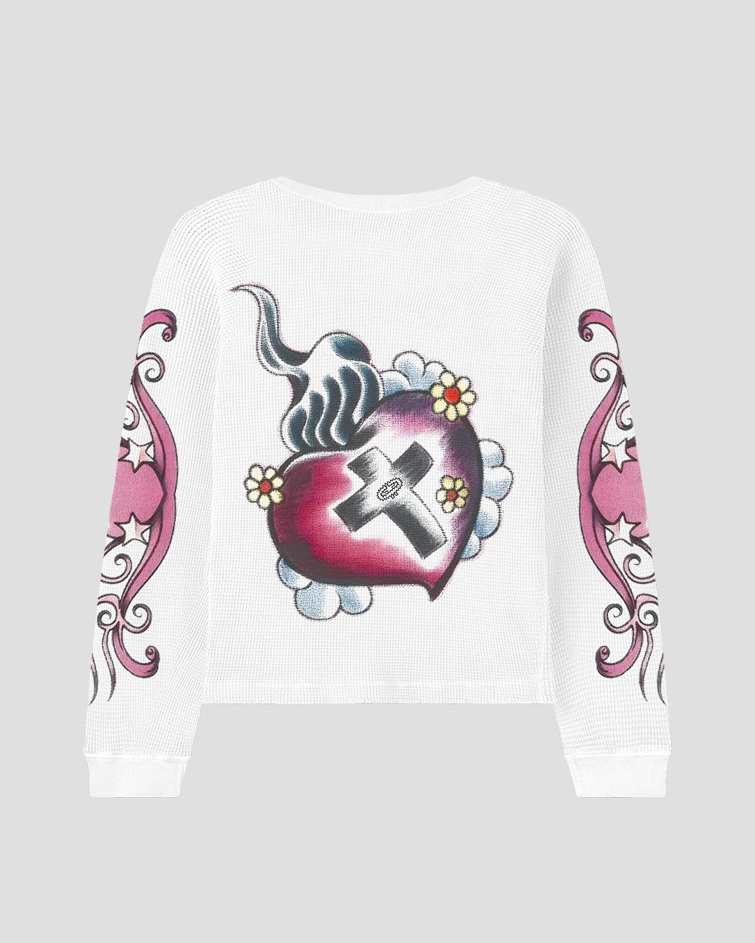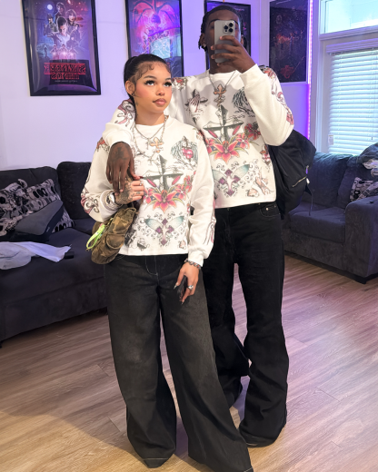 The Hearts & Petals Thermal reflects the delicate balance of love—its fragility and its strength. Intricate all-over prints of hearts, florals, and crosses tell a story of sacrifice and bloom, making each detail a symbol of devotion. Made from 400 GSM cotton, it’s a wearable testament to love’s enduring strength and power to transform.