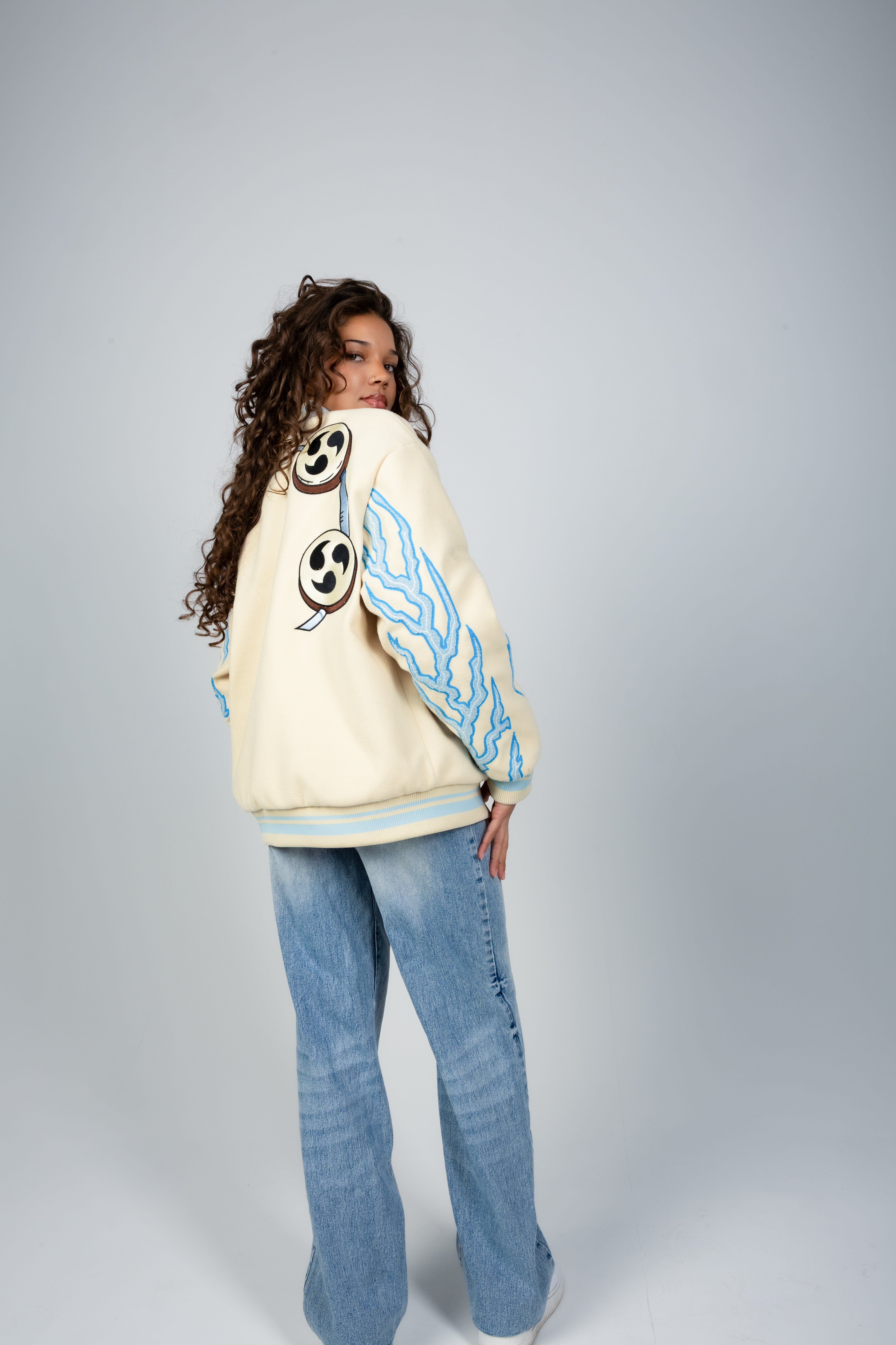 This varsity jacket that fuses timeless design with bold, anime-inspired artistry. Crafted in a warm beige tone, this jacket stands out through its meticulous detailing and unique cultural influences.
