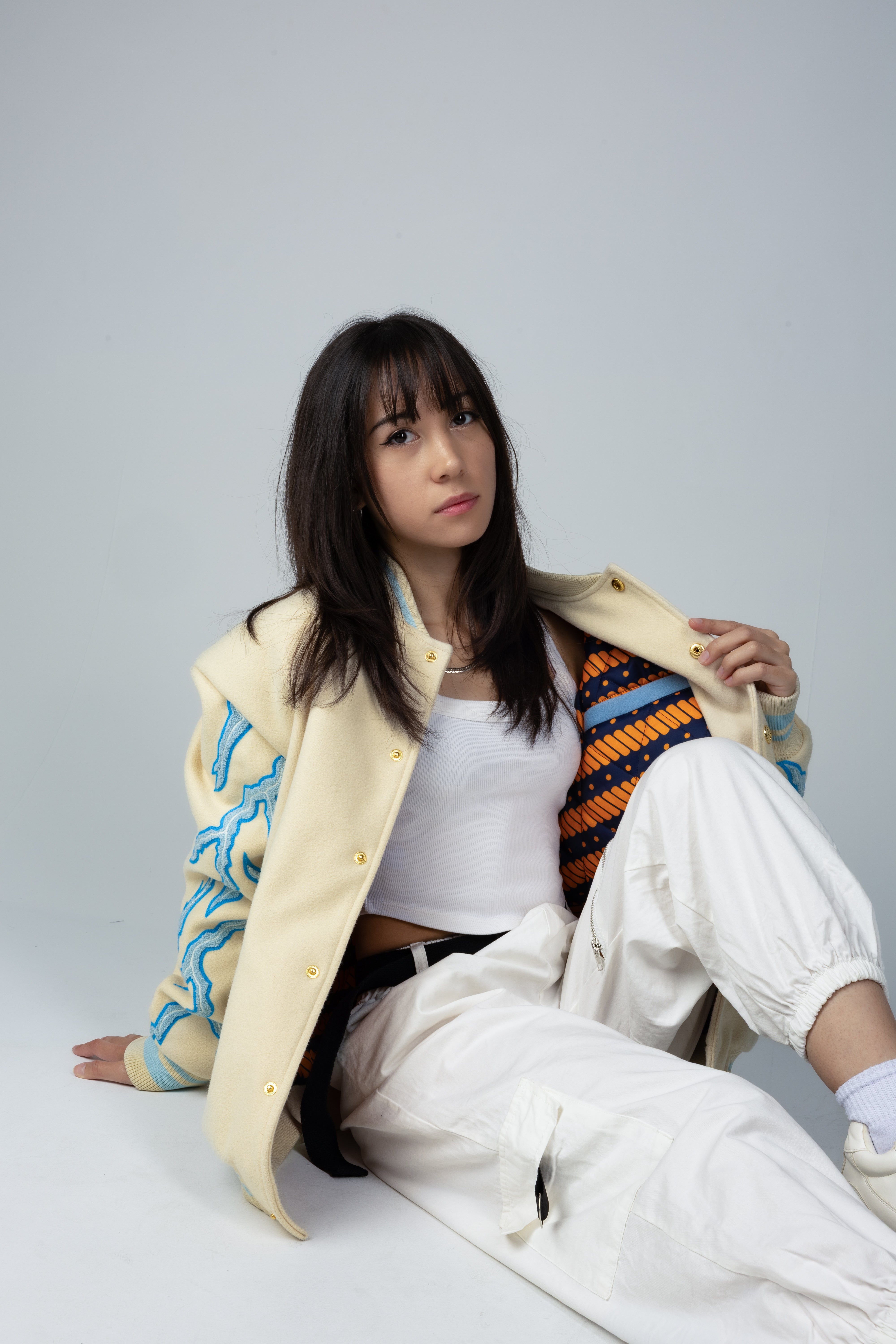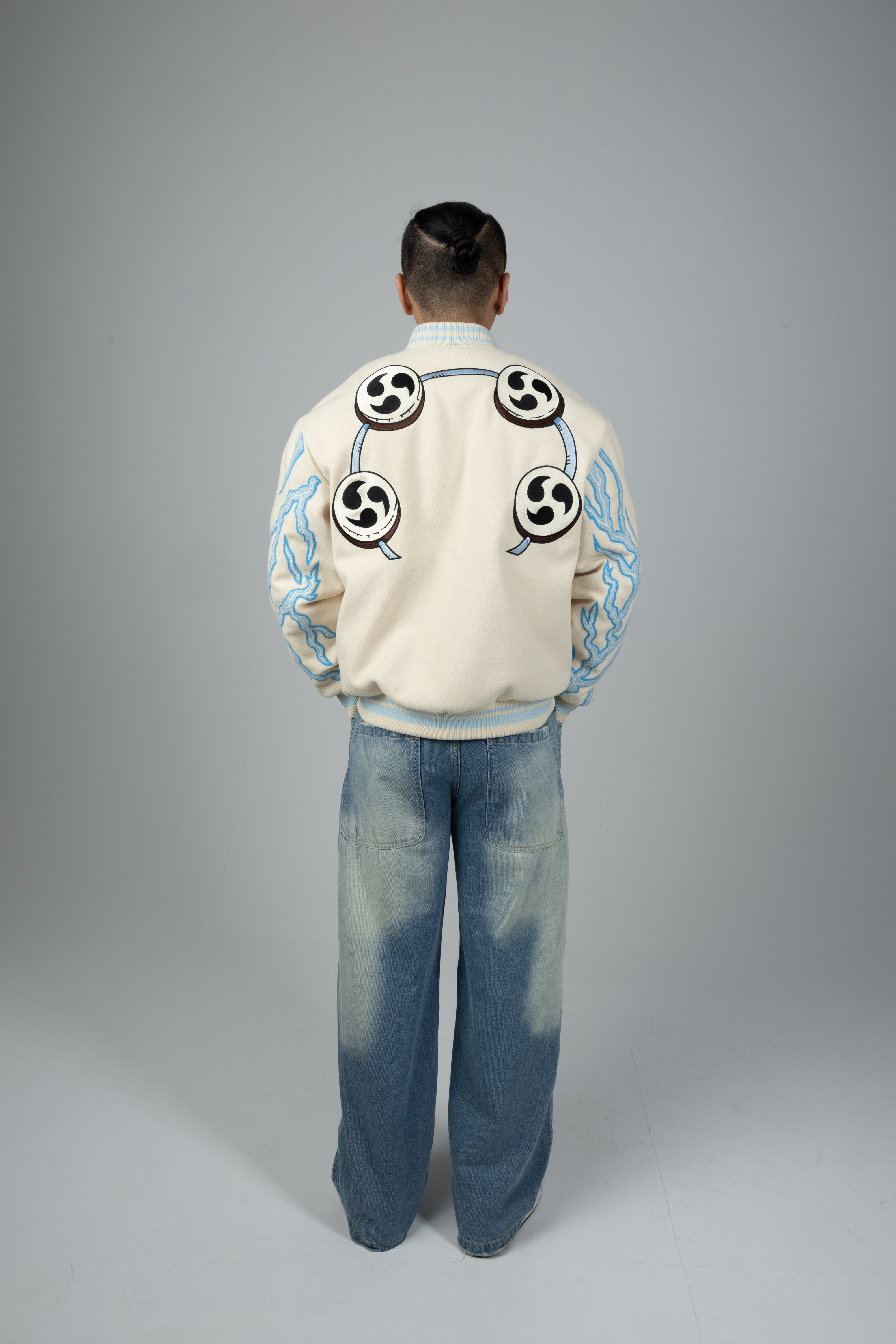 Chenille Embroidery with Radiant Detailing – Lighting-inspired chenille embroidery runs along the arms, giving the jacket an electric edge that feels both powerful and dynamic.